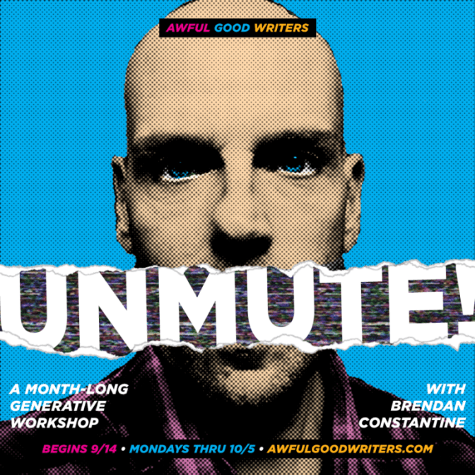 NOTE: See course details and costs at: https://awfulgoodwriters.com/courses/brendan-constantine-unmute/?fbclid=IwAR3DL0iNNdBJCoFn5KrMZw6_L3ua3DBb-NuEOn9miK12vaX1bD0BC-np7DE