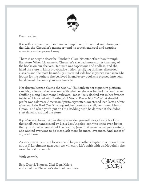 Poet and author of The Yellow House, Chiwan Choi posed his respects on Facebook saying, “absolutely devastated…Liz…made [Chevalier’s] my favorite bookstore in L.A. She used to check in on me every so often, encourage me, cheer me on…I don’t even know what to say. Damn it.”