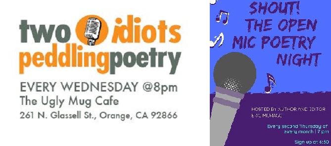 As more of the Los Ángeles literary community returns to in-person events, two long-running Orange County open mics, Two Idiots Peddling Poetry and Shout! the Open Mic, are joining forces, as Two Idiots said on Facebook, to “maintain an online reading.” They want to “continue to connect with our extended community beyond the borders of Southern California.”