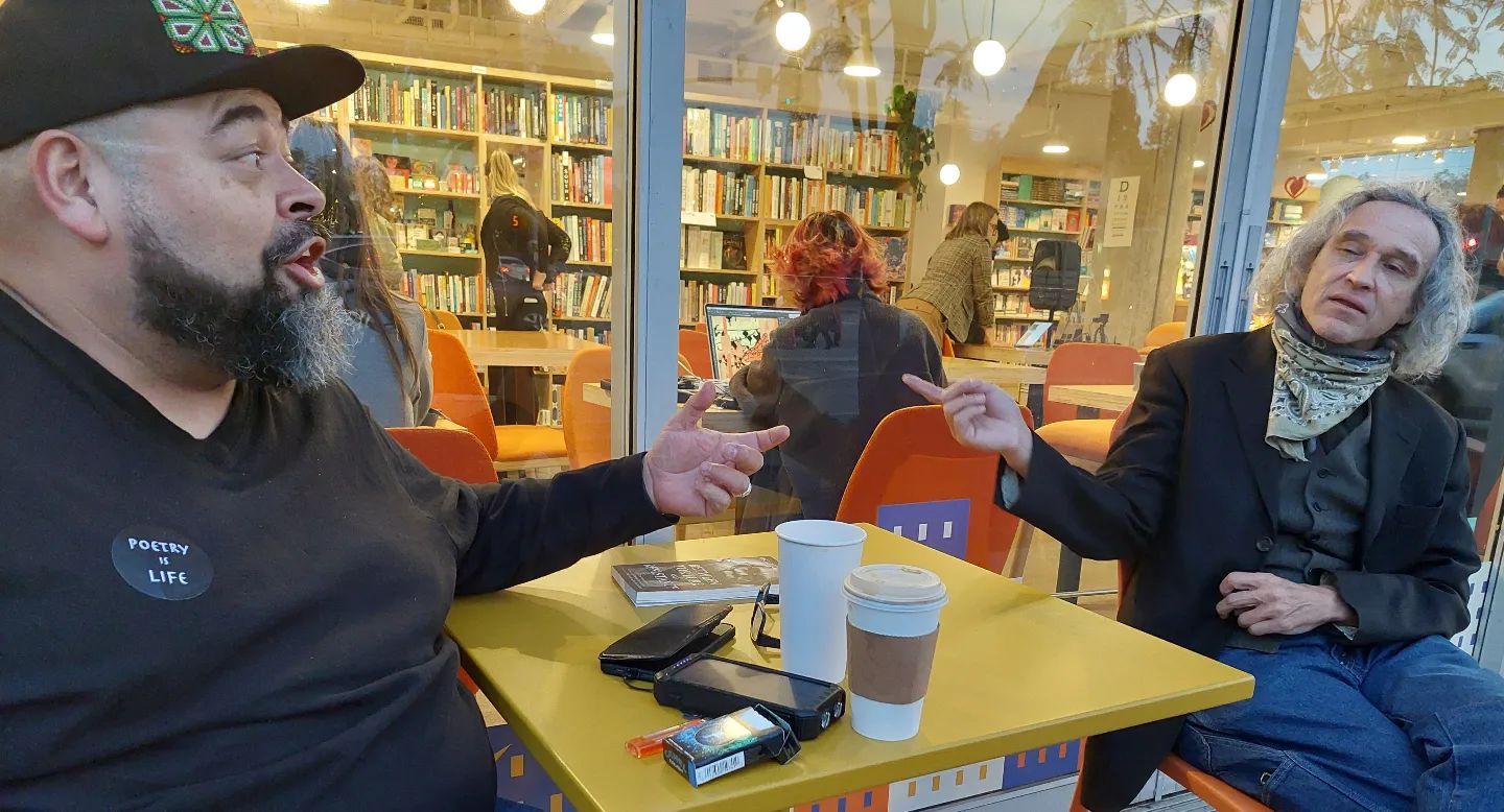 Before the reading began, two passionate publishers—Mark Lipman and Edward Vidaurre—sat at a table in front of the bookstore, lost in conversation. A photo was snapped of the two of them. Edward’s lips are parted in mid word, his left arm outstretched, hand in a gesture that seems to punctuate his words. Mark appears to be in mid-nod as if saying “yes, you’re right. But you know…” and index finger about to emphasize his thought. His caption of the photo on Facebook encapsulated the festival: “When two great editor/publishers meet…such a great way to end the book festival, sitting down with my counterpart from FlowerSong Press.”
