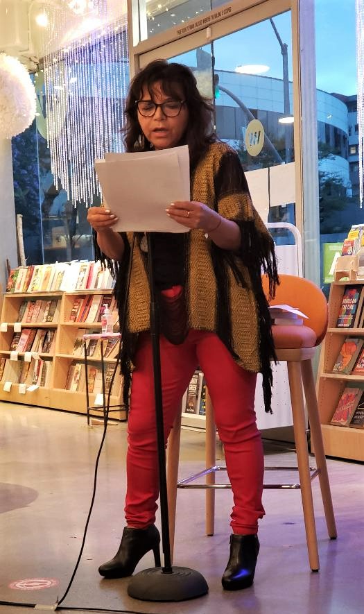 The most overtly political poet of the evening, Guardado kicked off her reading by speaking about the current state of El Salvador and how its president governs like an authoritarian, for example, sending police and soldiers to arrest gang members to decrease the murder rate, on as little as rumors of gang affiliation, delaying due process once in jail. After reading “This Burning Earth” dedicated to Rufina Amaya—December 11, 1981, from her debut collection Endeavor, Guardado read several from her upcoming collection, Cenizas, portraying a Salvadoran family whose lives have been shaped by the upheavals of global politics. At the end of the evening, the lightning round again demonstrated the distinct Latinx Voices of the World Stage Press. A poem about good times with family, another about going to the club with your girls on a Friday night. Then, back out into the cool Culver City evening, Village Well Books and Coffee now dark.