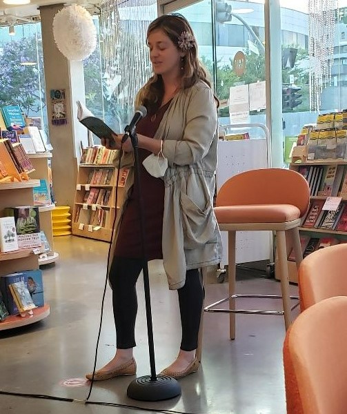 The most overtly political poet of the evening, Guardado kicked off her reading by speaking about the current state of El Salvador and how its president governs like an authoritarian, for example, sending police and soldiers to arrest gang members to decrease the murder rate, on as little as rumors of gang affiliation, delaying due process once in jail. After reading “This Burning Earth” dedicated to Rufina Amaya—December 11, 1981, from her debut collection Endeavor, Guardado read several from her upcoming collection, Cenizas, portraying a Salvadoran family whose lives have been shaped by the upheavals of global politics. At the end of the evening, the lightning round again demonstrated the distinct Latinx Voices of the World Stage Press. A poem about good times with family, another about going to the club with your girls on a Friday night. Then, back out into the cool Culver City evening, Village Well Books and Coffee now dark.