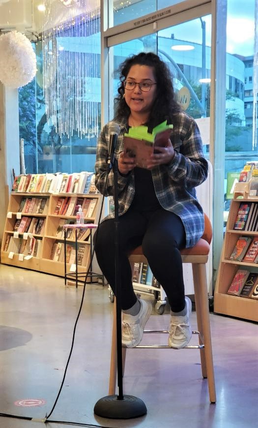 The host, Lisbeth Coiman, read first. She began by reading the opening to her self-published memoir I Asked the Blue Heron. “I was sixteen when my mother chased me with a hammer. I locked myself in the bathroom.” This was the late 1970s in Venezuela where the only place she could escape this domestic violence was “a correctional facility where there will be no distinction between a young woman running away from her angry mother and a young criminal.” After, Coiman read a few poems from her bilingual poetry collection Uprising/Alzamiento, deeply personal political poems that weave together Venezuelan history and current events with personal narrative to excavate what it means to love and grieve a homeland turmoil.