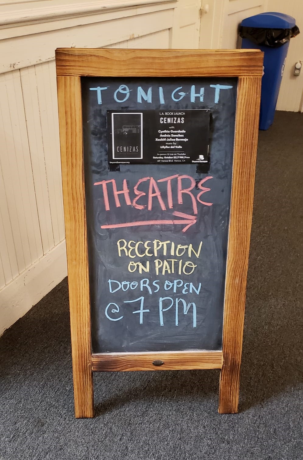 The theatre at Beyond Baroque was 70% full. The black lectern stood under a spotlight in the center of the stage area in front of a red curtain. Andrés Sanchez and Xochitl-Julisa Bermejo sat in chairs along the front wall, near the entrance, waiting for their turn to read.