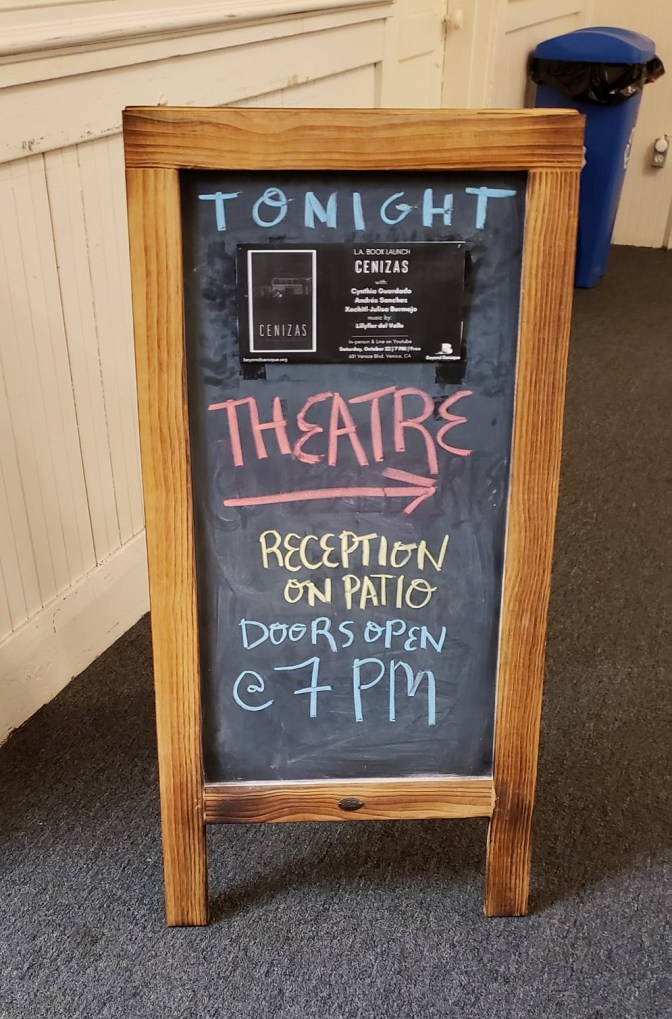 Back in the theatre, the audience had gathered for a book release party. For the release of Professor, Salvadorian American and Inglewood native, Cynthia Guardado’s, second book of poetry Cenizas. A collection of poems drenched in her Salvadorian identity, exploring the inherited past, the lived experience of a child of immigrants who continuously returns to their homeland, a “portrait of a family whose fate was shaped by global politics and conflict,” and “press[es] on the pulse of [the] exodus from El Salvador,” of its citizens due to the country’s civil war.