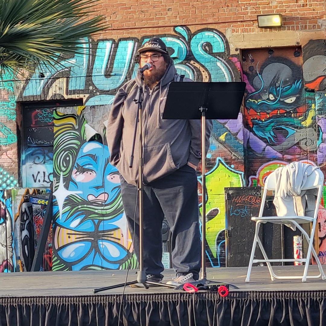 To close out the day, the Poet Laureate of Pomona, Ceasar Avelar, read outside in the Yost Parking Lot as part of Poet and Santa Ana College Professor, Donato Martinez’s reading, “The Magic and Beauty of the Urban.” Avelar spit proletariat verse in the cool air as the sun sank lower in the sky. The wind picked up from time to time.