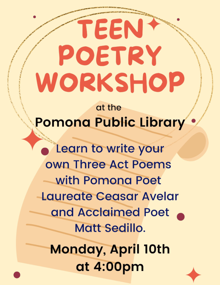 Join Pomona Poet Laureate Ceasar Avelar and Acclaimed Poet Matt Sedillo to learn how to write your own three-act poems in a Teen Poetry Workshop.