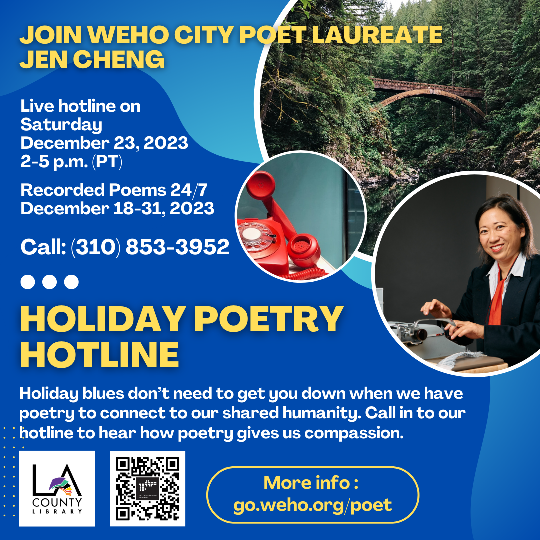 As it says in the city’s press release: “Holiday stress doesn’t need to get us down when we have poetry to connect us to our shared humanity. Inspired by the Poetry Pharmacy, the West Hollywood Holiday Poetry Hotline is designed and lead by…Jen Cheng to offer poetry and compassion during the winter holiday season.