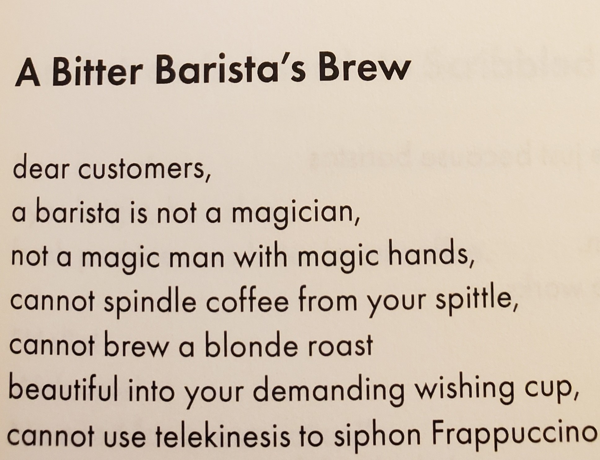 I was a barista at My Place Cafe in Pasadena for six months while hosting poetry and prose readings for two years over there. Early on with me hosting readings there, I thought there’s no way I’d be an employee there. Then at some point, I felt the need to help out the owner who was losing employees left and right. While I was a barista, I was rude to customers. Owner called me out on it. Still was rude after the fact. There were times I would work and host a poetry reading the same day, and I felt annoyed until after the poetry reading I curated was over. After I quit as a barista, I didn’t want to abruptly end the reading series, so I had mixed feelings the rest of 2022. Yet, all the remaining poetry and prose readings made me feel better. Sorry, all that is to say I deeply resonated with this poem. What poems do you think readers of The Art of Job Hunting will resonate with?