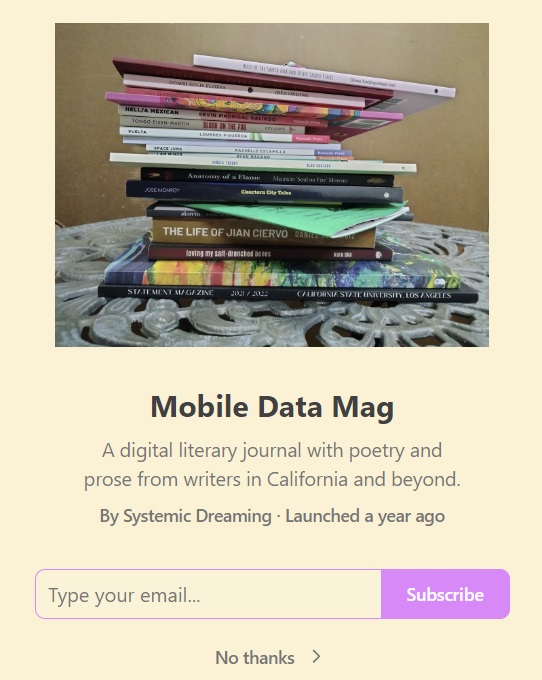 Tovar: Mobile Data Mag (formerly known as Lit Stack) got started because I wasn’t sure if I would put together my own event anytime soon. Since My Place Café reading series ended, my time freed up. In early 2023, I was only doing Altadena Poet Laureate events and helping out with Four Feathers Press events. I thought after Spring, I was free from serving the writing community so I can look for work and balance out the rest of my family situation. So, the lit journal was my way to stay connected to the LA poetry scene if I “disappeared.”