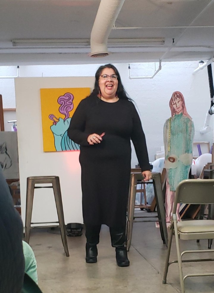 Before Brenda Vaca introduced the final reading “Unsung Heros,” the most powerful moment occurred. Vaca brought into the room the genocide in Gaza. She wanted everyone not to forget the inexcusable destruction of hospitals, of children’s lives and civilian neighborhoods. She called for a cease fire and read a poem.