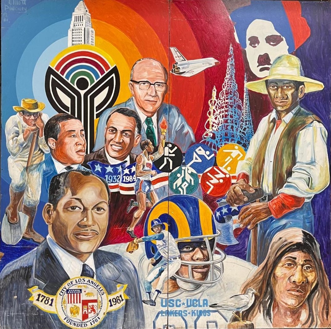 Before the reading and workshop we toured the WLCAC’s massive gallery and sure enough there were incredible Pinkney pieces as well as dozens of other paintings and sculptures by other artists, including one by Noni Olabisi. I took photos of Pinkney’s work reveling in the moment. It was a cycle of six interrelated paintings from 1981 that shined a light on Black Los Ángeles featuring individuals like Mayor Tom Bradley, Jackie Robinson, Kareem Abdul-Jabbar, Charles Mingus, Wilt Chamberlain, Elgin Baylor, Sportscaster Jim Hill, Sammy Davis Jr., and many others along with iconic Los Ángeles imagery like the Watts Towers, City Hall, the city seal and institutions like the Rams, Dodgers, Lakers, USC and UCLA. One of the works commemorated the 200th anniversary of Los Ángeles’s founding inscribed with 1781-1981.