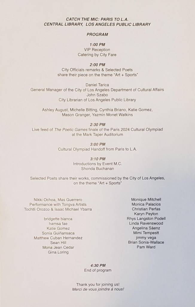“In honor of the L.Á. 2028 Olympics,” a Beyond Baroque Instagram post says, “eight L.[Á]. poets selected as Paris Olympiad Poets [traveled] to Paris to perform in the finale of the Poetic Games.” These poets included former West Hollywood Poet Laureate Steven Reigns and former Los Ángeles Poet Laureate Lynne Thompson.